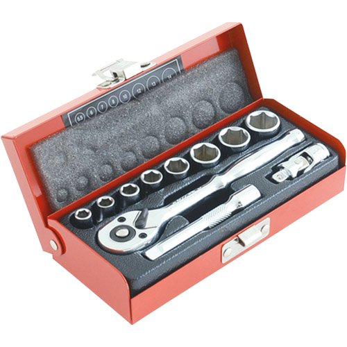 小ボルト・ナットの締め付け、取り外しに最適 商品名 TS-211M 1/4ソケットレンチセット メーカー品番 TS-211M 材質 クロームバナジウム鋼 特長 72山ギア採用の高機能ラチェットハンドル。 狭い場所でも作業性は抜群です。 プッシュリリース&キャッチ機構採用で、ソケットの着脱が簡単・確実です。 ボルトの角に優しい面接触加工です。 セット内容 11PCS ソケット(5.5・6・7・8・10・12・13・14mm) ラチェットハンドル エクステンションバー75mm ユニバーサルジョイント 収納用メタルケース 注意 角ドライブは根元まで完全に差し込んでくださいハンドルにパイプを継ぎ足したり、ハンマーなどで叩いたりして使用しないでください。割れ、欠け、磨耗、変形等の異常が認められた場合は、使用しないでください改造しないでください。 無理な姿勢で作業しないでください。使用はホコリや湿気を避けて、きれいな状態で保管してください本来の目的以外での使用はしないでください。 サイズ ケース寸法(幅×奥行×高さ)mm:167×78×40