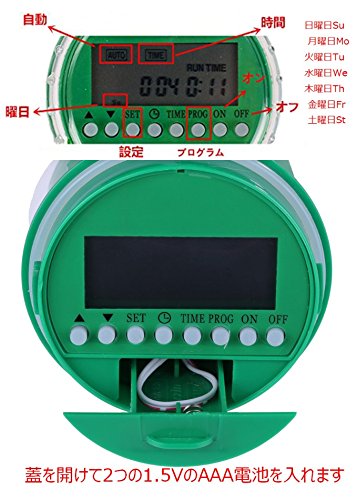 プログラムの設定:「PROG」ボタンを押して、番号を選択する→「SET」ボタン押して確認する→開始時間設定→「SET」ボタンを押して確認してスキップさせる→開放時間設定→「SET」ボタン押下で確認してスキップさせる→日数を設定→設定完了