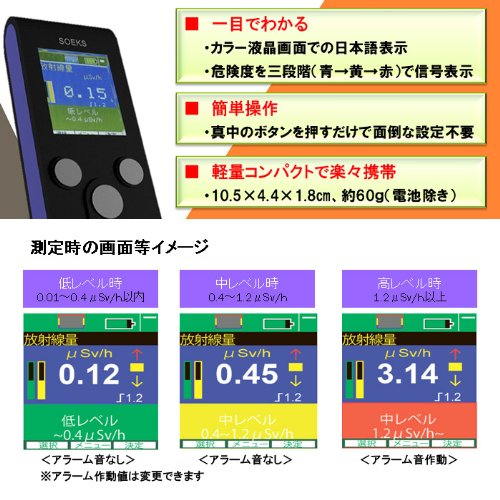 英語版はファームウェアのアップデートが出来ないので当時最新でも新しいファームウェアが出ると買い換えでした。 この日本語版はメーカーサポートでファームウェアのアップデートが可能になりました! ご年配の方では取説だけが日本語でも使いづらいという声を頂き完成したこの1台。 電源を入れたら即計測開始! よくこの数字は放射線が低いのか高いのかわからない とお問い合せを頂きました。 そこで「低レベル」・「中レベル」・「高レベル」を日本語で表示!! 取説がなくても一目でわかります! ※併せて青・黄・赤で危険度を表示