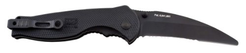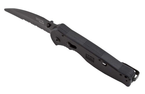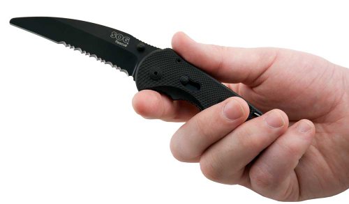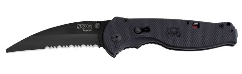 The Flash Rescue has got to be one of the coolest knives we致e ever seen. Forget its wicked-quick blade access, that it handles like a race car on rails, or that it locks up like Alcatraz. It just looks and feels extraordinary. The Flash family of knives feature SOG Assisted Technology (S.A.T.), which employs a powerful piston lock that is easily released with a sliding button. The Flash Rescue comes standard with glass-reinforced nylon (GRN) handle and 1/2 serrated sheep痴 foot blade in Black TiNi finish. All Flash knives come standard with SOG痴 patent pending, reversible bayonet mounted clip that ensures the lowest, most discreet carry possible. We also had the foresight to incorporate an additional safety lock that gives added security when the blade is closed. Blade Length: 3.5" x .125" Overall Length: 8" Weight: 3.1 oz. Edge: Partially Serrated Steel: AUS 8 HRC: 57-58 Handle: GRN Finish: BlackTiNi Sheath: N/A Country of Origin: Assembled in the USA