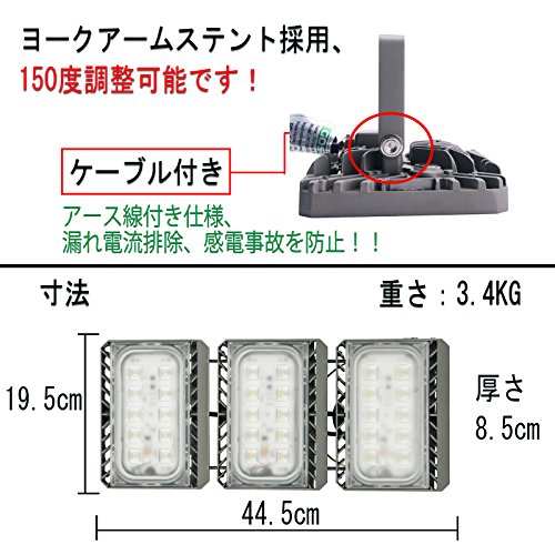 仕様: 消費電力: 50W×3 電圧: AC100-120V 色: 灰色 IPレート: IP65 材質: アルミダイキャスト ケーブル長さ: 1M 輝度: 13500LM 色温度: 電球色(2800-3200K) LEDチップ: CREE SMD5050 LED素子数: 30pcs 寸法: 445*85*195MM 推奨照明距離(m): 15m 最大照明距離(m): 15-18m 照明範囲(m2): 30-40m2 稼働温度: -30℃- +50℃ 寿命: 30000時間以上 重量: 3.4KG パッキングリスト: ●150WLED投光器×1 ●ユーザーガイド×1