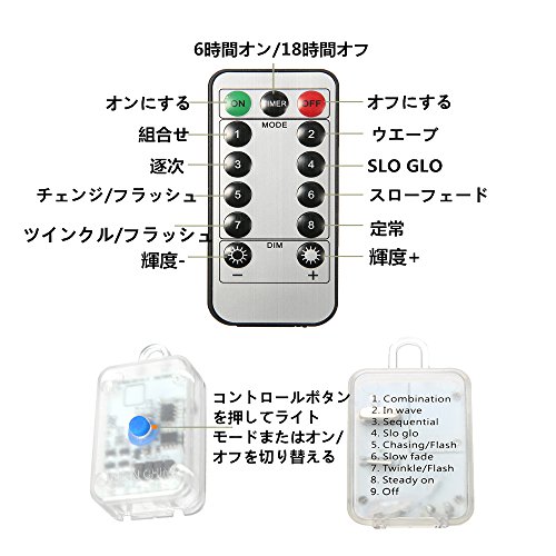- 8種類のモードを持っています。組合せ、ウエーブ、逐次、SLO GLO 、チェンジ/フラッシュ、スローフェード 、ツインクル/フラッシュと定常です。リモコンを通して、好きなモードを選択することができます。発光色はウォームホワイトで、暖かい雰囲気や照明効果を作れます。