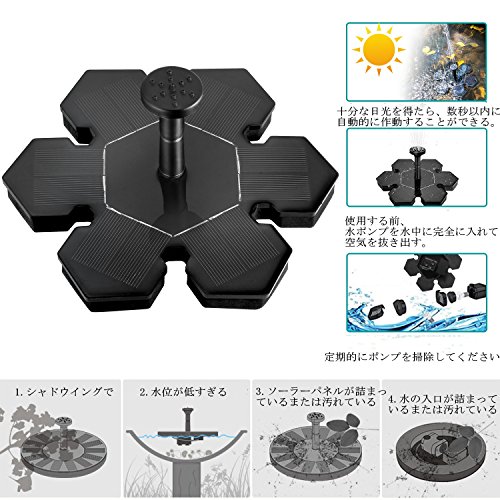 - 「ソーラー水中ポンプ」:太陽光発電で大きな花弁の形のソーラーパネルは高い効率をもたらします。バッテリーや電気がない、日当たりの良い場所に置いてください。日光が十分であれば、始めに自動的に作動することができる。