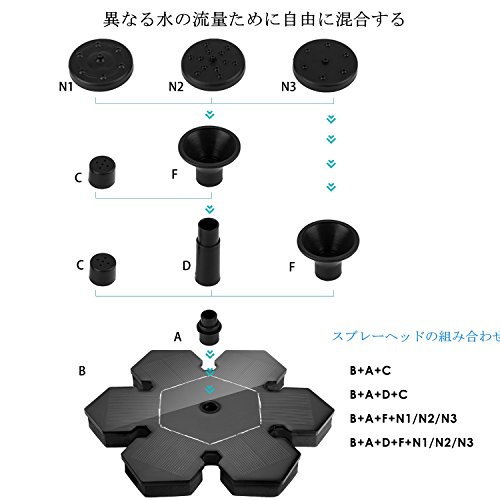 - 「4種類のノズル」:このソーラー水ポンプには4種類のノズルがあって、吹き出す水の形や高さを調整できます。具体的な操作方法は、図4に従ってインストールしてください。