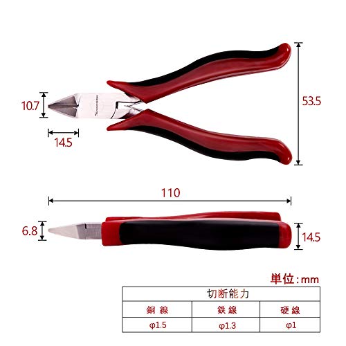 - 【用途】切断能力:銅線φ1.5mm、鉄線φ1.3mm、硬線φ1mm。プラスチックの成型後の切断作業、バリ取り作業やプラモデルの製作等に最適です。三角形のスリムな刃先で、今まで切断しにくかった狭い箇所での繊細な作業が容易となります。模型の組立やアクセサリー製作、銅線、針金、ピアノ線などの線材の切断にお使いいただけます。