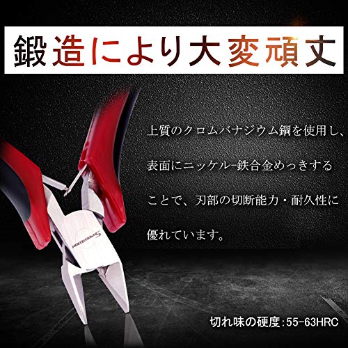 - 【仕様】全長約110mm、重量47g。先端角度:20度。入念な焼入れ処理が施されたつかみ面の硬度は約HRC55-63で、プライヤーの切断力が抜群です。(錆がつかないの為に、少し油が付きます。布できれいに拭き取ることができます。)