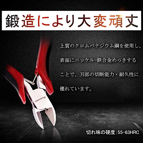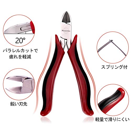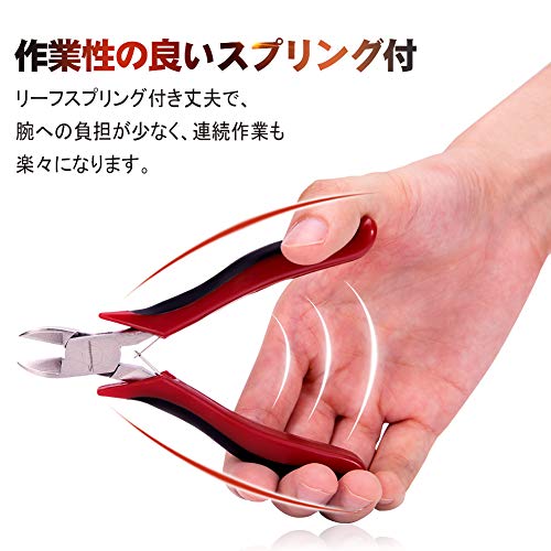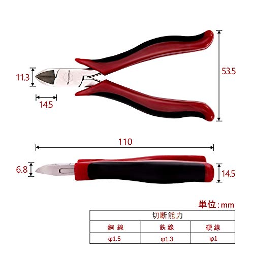- 【用途】切断能力:銅線φ1.5mm、鉄線φ1.3mm、硬線φ1mm。プラスチックの成型後の切断作業、バリ取り作業やプラモデルの製作等に最適です。円錐形のヘッドで、基板上での作業に向いています。模型の組立やアクセサリー製作、銅線、針金、ピアノ線などの線材の切断にお使いいただけます。