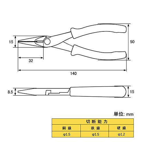- 【切断能力】軟鉄線φ1.2mm、軟銅線φ2.0mm、より線φ2.0mm、ピアノ線φ1.5mm、ステンレスφ0.9mm。