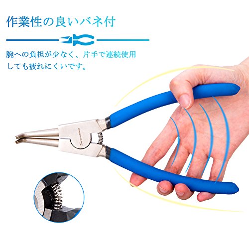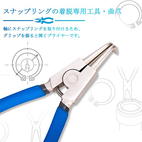 - 【用途・特徴】工作機械・電子機器等のC型止め輪(スナップリング)の着脱専用工具です。穴にスナップリングを取り付けるため、グリップを握ると開くプライヤーです。先端クローは曲爪です。バネ付きなので腕への負担が少なく、連続作業しても疲れにくいです。