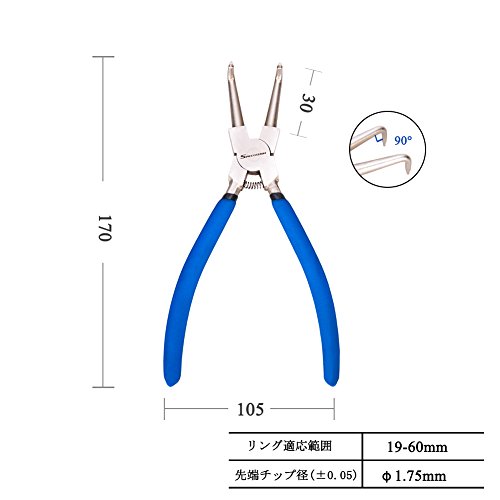 - 【用途・特徴】工作機械・電子機器等のC型止め輪(スナップリング)の着脱専用工具です。穴にスナップリングを取り付けるため、グリップを握ると閉じるプライヤーです。先端クローは曲爪です。バネ付きなので腕への負担が少なく、連続作業しても疲れにくいです。