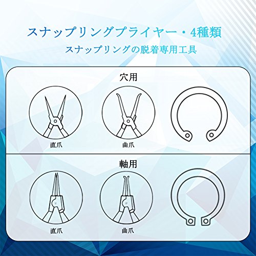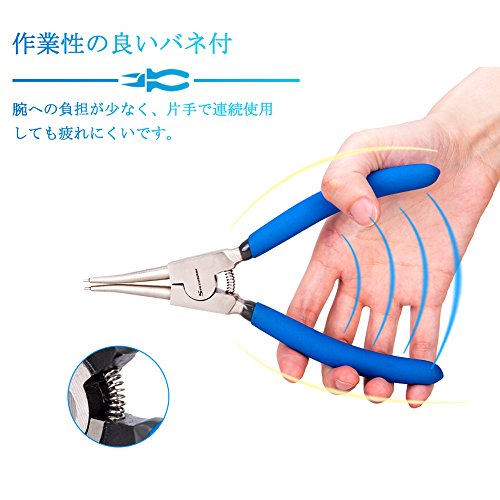 - 【用途・特徴】工作機械・電子機器等のC型止め輪(スナップリング)の着脱専用工具です。軸にスナップリングを取り付けるため、グリップを握ると開くプライヤーです。先端クローは直爪です。バネ付きなので腕への負担が少なく、連続作業しても疲れにくいです。