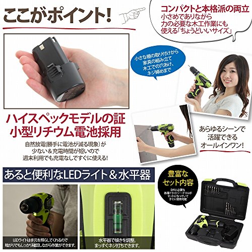 - セット内容 本体 電池パック 充電アダプタ 取扱説明書 ドライバービット6本(ph1,ph2,pz1,pz2,#5,#6) ドリル刃 6本(1.5㎜、2.5㎜、3㎜、4㎜、5㎜、6㎜)