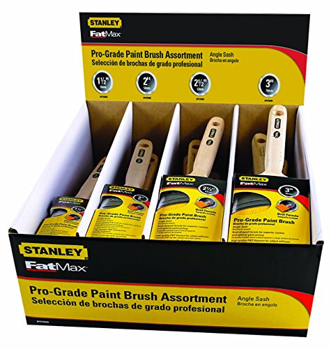 Hand crafted. 16 piece assortment of Stanley FATMAX PBT filament professional long angle sash paint brushes in a small countertop assortment display case. Contains: (4) 1.5", (4) 2", (4) 2.5" and (4) 3" long angle sash. FATMAX PBT filament professional paint brushes are designed to perform well with all paints and have superior performance with today's low VOC and "paint and primer in one" coatings. PBT filament is engineered to retain stiffness in high temperature and humid environments, has high abrasion resistance and durability and is solvent resistant for easy clean-up and reuse. Hard natural sanded beech wood handles with low moisture absorption prevents handles from contracting and expanding leading to a longer brush life. Oval shaped stainless steel ferrules are thicker than standard brushes maximizing paint pickup and release and deliver smooth even coverage. Each Stanley FATMAX paint brush is hand crafted and is designed for the professional painter or serious do-it yourselfer who expects the best results. From the Manufacturer:.