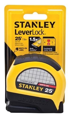 スタンリーのメジャーリングテープ。 メジャーのロックは本体をした方向に押すことで解除します。日本人にもわかりやすい分数表示です。 測定したもののセンターを見つけたい時は、表示の下に書かれていてる赤い表示が中心部になります。 アメリカララの輸入品のため日本語の取扱説明書はありません。