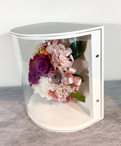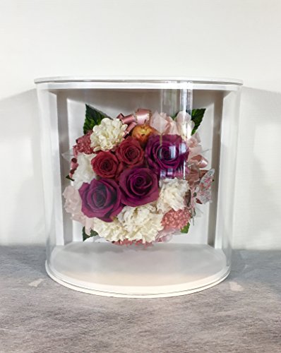 - 半円型のクリアカバーの中、まるで宙に浮いたようにアレンジしたお花を横からもお楽しみいただけます。