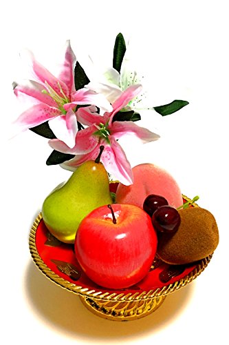 - 上品なお花と本物そっくりなフルーツの食品サンプル5種を豪華な金盆にアレンジしました。お供えやインテリアディスプレイにご使用ください。