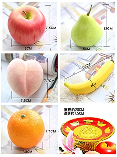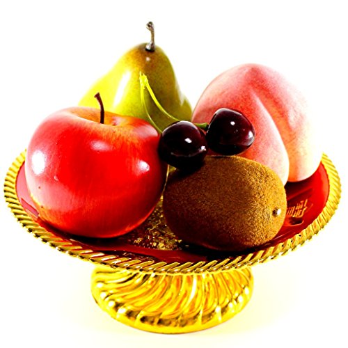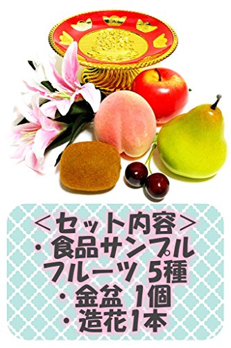 - <フルーツ>リンゴ、チェリー、洋梨、桃、キウィ (5種) 各1個。造花と一緒に金盆にアレンジしたものを、OPP袋でラッピングしてお届けしますので、届いたらそのまま飾っていただけます。