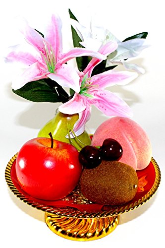 - ※ 金盆のサイズ:盆直径 約20cm 高さ 約7.5㎝ 足部直径 約10cm。 フルーツ各種のサイズは画像をご参考下さい。輸送途中で向きのズレなどが生じ気になる場合はお好みの向きに直して下さい。造花はランダムです。画像と同じお花にならない場合がございますのでご了承ください。