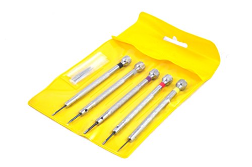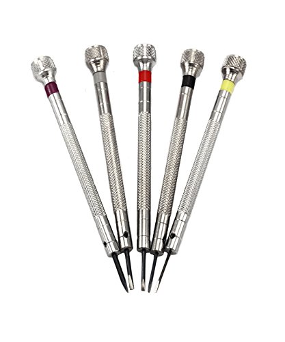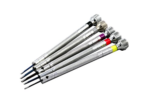 時計、メガネなどの小さなネジを扱うのに非常に便利なドライバーセットになります。直径7.5cmのハンドル部のトップが回り、簡単にネジを回すことが可能です。ドライバーは5色に色分けされており、ブレイドサイズはそれぞれ、0.8mm、1.00mm、1.20mm、1.40mm、1.60mmになります。予備のドライバー先端(ブレイド)が5本付属します。