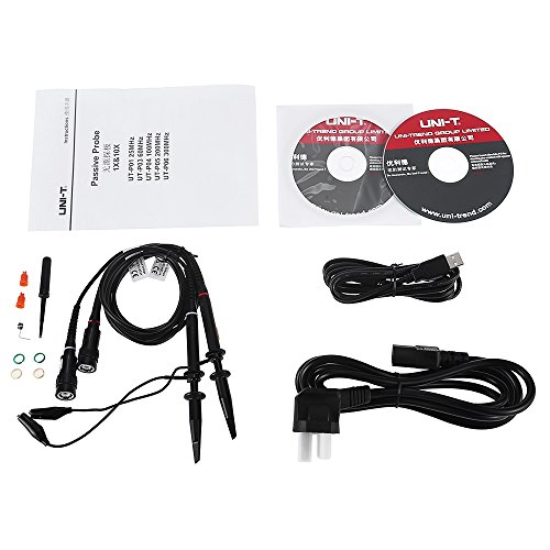 1 xデジタル・オシロスコープ、1 x英語ユーザー・マニュアルCD、1 xソフトウェアCD、1 x USBケーブル(1.5 m)、1 x電源ケーブル(1.7 m)、1 xカラーホイール・ツールセット、1 x英語パッシブ・プローブ命令、2 xプローブ