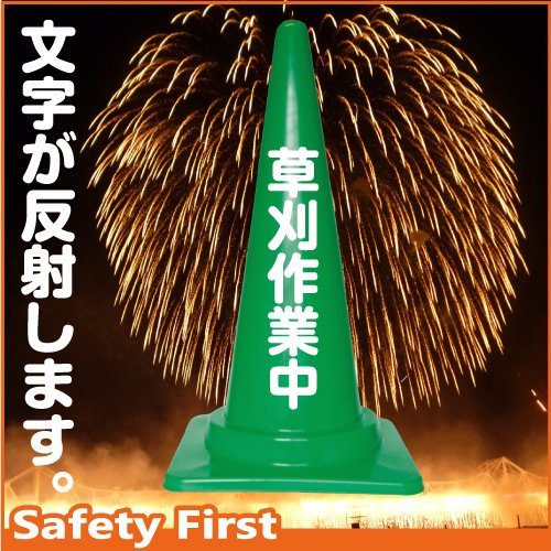 Safety First 草刈作業中 文字入りカラーコーン 緑 反射文字(片面)