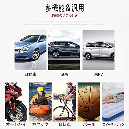 - 【幅広い用途】3種類のアダプターノズルが付属します。中&軽自動車(SUV含み)、自転車、バイク、ボール、浮き輪、小型インフレータブル玩具などに対応可能。