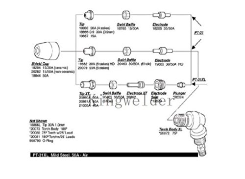 - プラズマ切断機(カッター)トーチ消耗品セット。摩耗したチップでは、エアーが斜めに出たりスパークがうまく発生しない事があります。