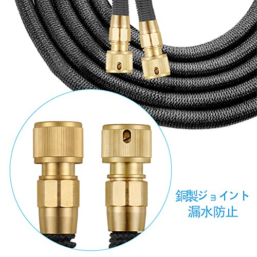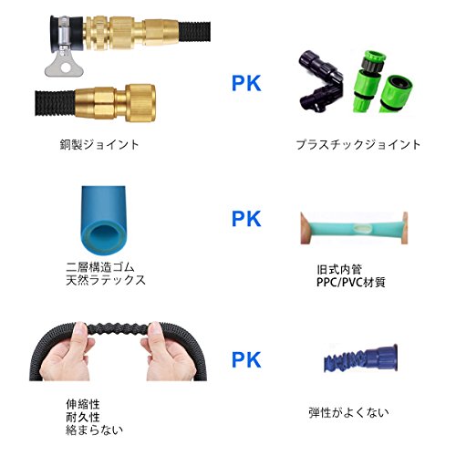 - 【漏水防止】市販の伸縮ホースを見た、負荷のかかるところは連結部分です。それにより根元からの水漏れが非常に多く、当社ホースはアタッチメントの内側をホース内側が 通って装着されています。耐熱、耐久試験でも、根元からの水漏れがなくなります。そして、銅製コネクターを採用、耐久性があり、亀裂、破損、水漏れなどの心配もありません。