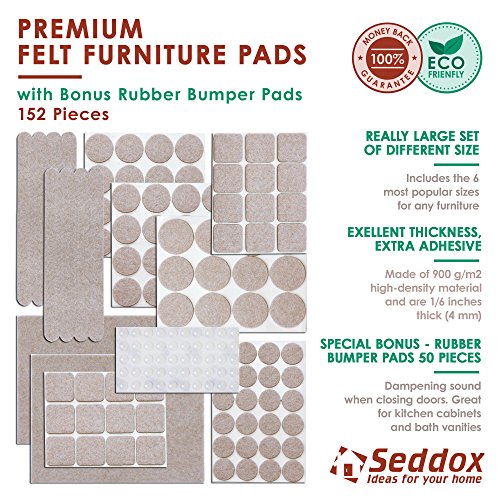 seddoxプレミアムフェルト家具パッドセット – 152ピースIncludingボーナスゴムノイズバンパー – Extra粘着Hardwoodの床プロテクター、フェルトパッド椅子脚 S ベージュ Seddox