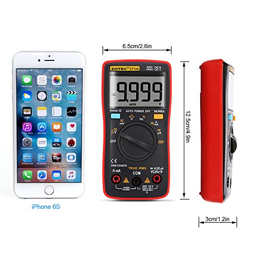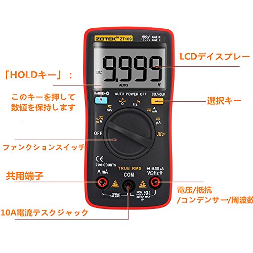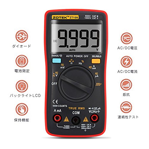 - 【多用途】電流、電圧、抵抗値、静電容量、周波数、DUTY、導通テスト、ダイオードテストなどに対応。幅広いレンジの切り替えにより、高い精度での各測定が可能なマルチメーターです。自動車および家庭における様々な電気のトラブルを、より安全かつ正確に解決するよう設計されたデジタルマルチメータです