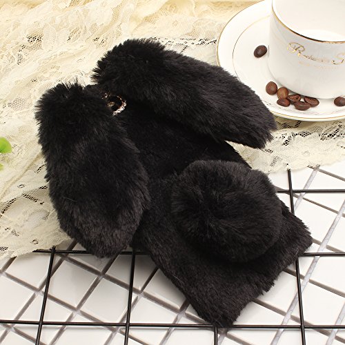 HuaWei Honor 9かわいい、SevenPanda HUAWEI [ぬいぐるみのウサギのケース]手作りの保護ケーススタイリッシュなデザイン3Dダイヤモンドラインストーンがクリスタル輝くクリスタル輝くクリスタルラインストーンデザインボウ電話ケースを透明にする透明なTPUシリコーンソフトぬいぐるみウール暖かいウサギウサギ毛皮毛の携帯電話アンチスクラッチシェルバッグ毛皮ウサギバニー 毛皮のふわふわのソフトケースカバー薄いシェルHuawei Honor 9 - ブラック