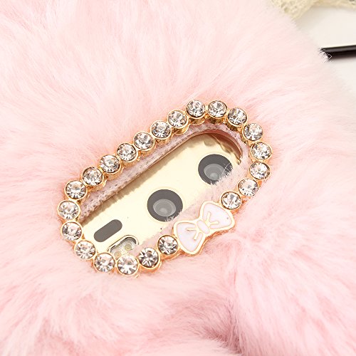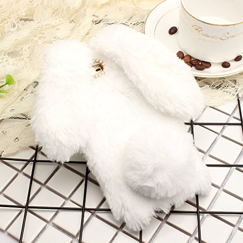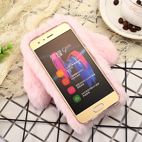 Hua wei Honor 9ケース、SevenPandaぬいぐるみウサギケース手作り保護ケーススタイリッシュなデザインかわいい3Dダイヤモンドラインストーンクリスタル輝くクリスタル輝くクリスタルラインストーンデザインボウ電話ケース透明TPUシリコンソフトぬいぐるみウールふわふわウサギウサギ毛皮の髪の携帯電話反傷のシェルバッグ毛皮ウサギバニーファー ふわふわのソフトケース保護カバーHuawei Honor 9のための薄いシェル - 白