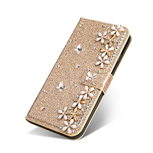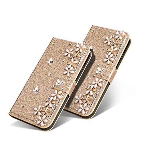 Huawei P10、[ラッキー花]ダイヤモンドグリッタークリスタルラインストーン 3Dラッキー花柄ジュエルプレミアム磁気クラスプ用 SevenPanda ラグジュアリーブリンブリン花PUレザーウォレットケースフォリオは、耐衝撃保護カードスロットホルダーは、 用カバーシャイニーフルボディケーススタンドフリップ ために Huawei HUAWEI P10 - ゴールド