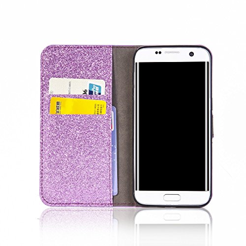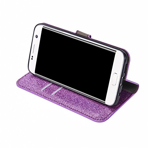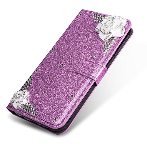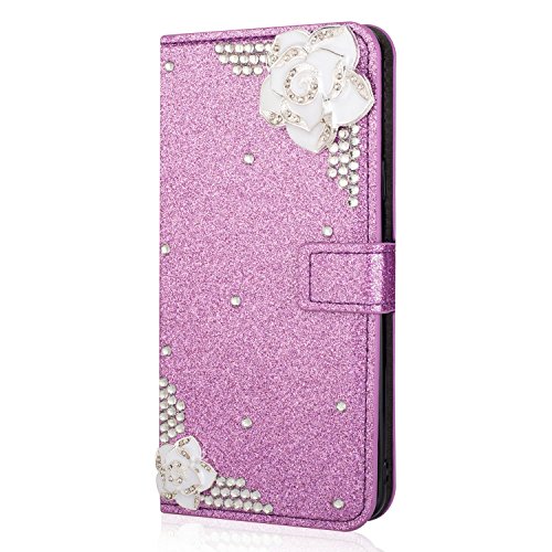 PUレザーケースカバーGalaxy S6 Edge、SevenPandaラグジュアリーダイヤモンドキラキラクリスタルラインストーン 3Dカメリアフローラルパターン宝石プレミアム磁気フリップフォリオスタンド耐衝撃保護カードスロットホルダースタンドカバー光沢のあるフルボディの携帯電話ケースSamsung Galaxy S6 Edge - パープル