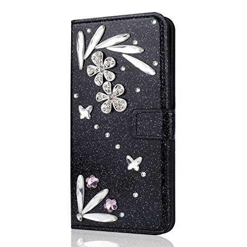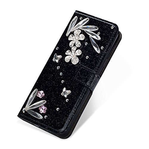 Samsung S6 Edge ウォレットケース、SevenPanda高級ブリンブリンダイヤモンドキラキラクリスタルラインストーン [3D DIYフェザー]フェザーフラワープレミアムPUレザー磁気フリップフォリオスタンド耐衝撃保護カードスロットホルダースタンドカバーシャイニングフルボディケース Samsung Galaxy S6 Edge - ブラック