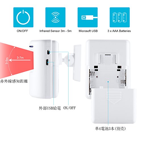 - 動体検知:人の動きを感知して送信。感知距離3~7m。ドアの近くに設置して防犯効果にも期待できます。自宅、事務所、店、ホテル、銭湯、居酒屋などに場所に使えます。