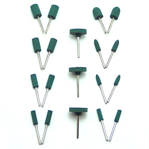 業務用 軸付きのゴム砥石の砲弾型/円筒型、各5サイズ+T型25㎜のセットです。 軸径はすべて3㎜、ミニルーターや、エアールーター、エアードリルで使用可能です。