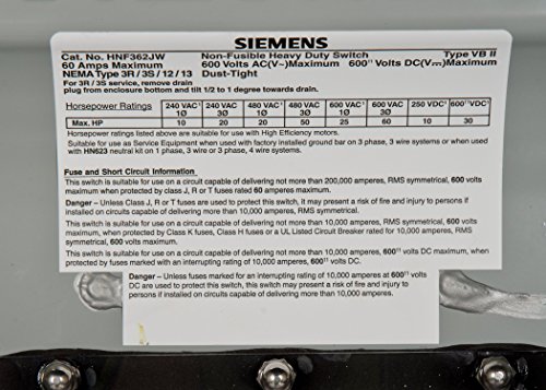 Siemens HNF362JW 60-Amp 3 Pole 600-volt Non-Fused Heavy Duty Safety Switches [並行輸入品]
