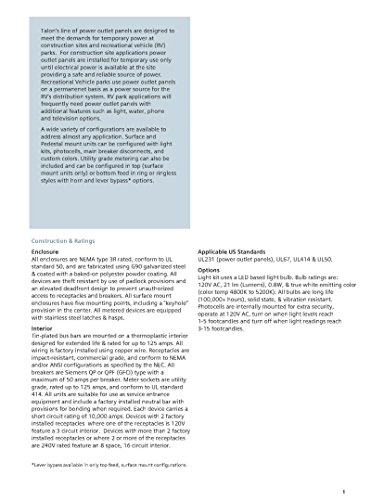 Earth burial mount pedestal, unmetered. Talon's line of power outlet panels are designed to meet the demands for temporary power at construction sites and recreational vehicle parks. For construction site applications, power outlet panels are installed for temporary use only until electrical power is available at the site. Recreational Vehicle parks use power outlet panels on a permanent basis as a power source for the RV's distribution system. A wide variety of configurations are available to address almost any application. Design options include surface (pole mount) and pedestal mount construction, with or without meter socket provisions, and top or bottom feed.