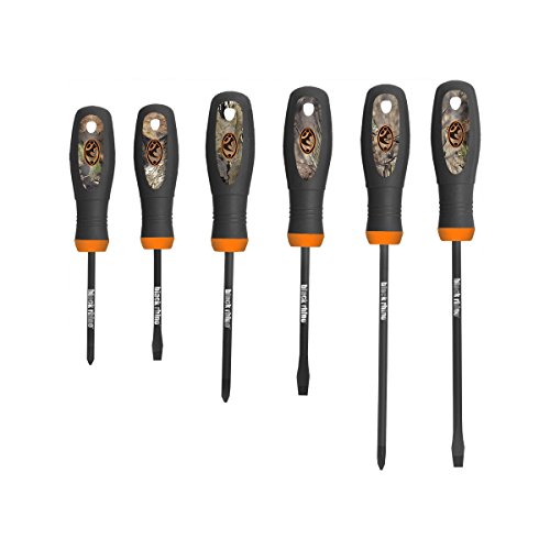 Three flathead sizes. Offering three different Phillips head sizes and three different flathead sizes, the Camouflage Screwdriver Set is an essential addition to any dedicated outdoorsman's toolkit. The Mossy Oak Country camouflage pattern brings a taste of the hunt to whatever job is at hand, and blaze orange accents maintain visibility when you're working. The industrial-grade steel construction and comfortable rubber grip ensure long-lasting comfort and performance, while holes in the handles make for easy hanging on your workbench pegboard.