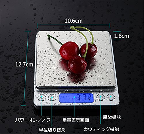 - 自動校正、風袋引き機能、自動パワーオフ機能(時間設定でき)、カウンティング機能など付き、LEDバックライト付いていて見やすくなります。
