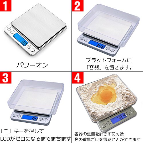 [風袋引き機能]容器を乗せてから重さを0にする風袋引き機能で、容器の中身だけはかることが出来ます。