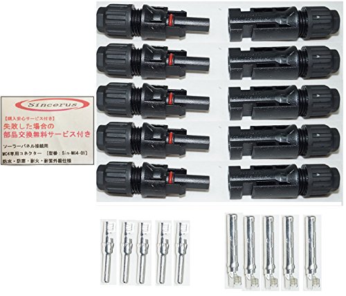 ソーラパネル 接続用 MC4 専用 コネクタ オス メス セット 国際規格 TUV 認定品 高耐候 耐熱 防水 防塵 Wチェック検品+PL保険加入済み 購入 安心 失敗 部品 無料 交換 サービス付 1組 - 1,000組 Sinceru (5組)