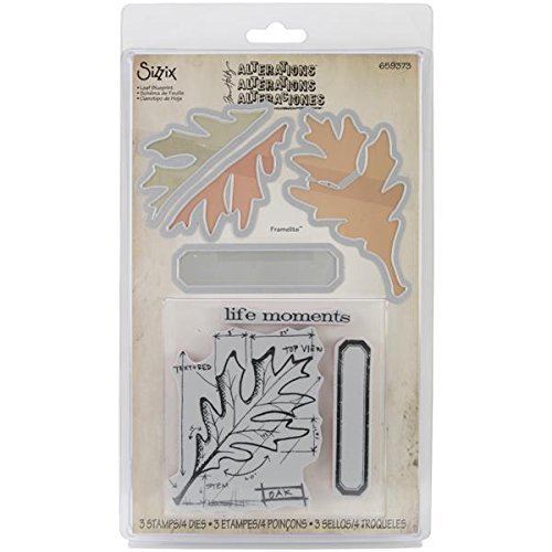 SIZZIX-Framelits Stamp and Die-Cut Set. Making custom die-cuts with stamped imagery is easy and efficient with this set! Simply stamp your image and then cut what you see! The dies are also excellent for cropping photos precisely or cutting windows in cards bags boxes and scrapbook pages. Designed to cut a single sheet of cardstock paper metallic foil or vellum the dies also make great stencils and the stamps look great all on their own! Dies work with Sizzix BigKick Big Shot and Vagabond machines (not included). This package contains Leaf Blueprint: a set of four dies measuring approximately 2-3/8x4-1/4 to 3-1/4x3/4 Inch and three coordinating stamps on a 4-1/2x4-1/2 inch backing sheet. Designer: Tim Holtz. Imported.