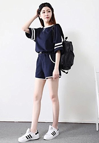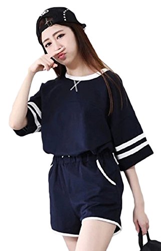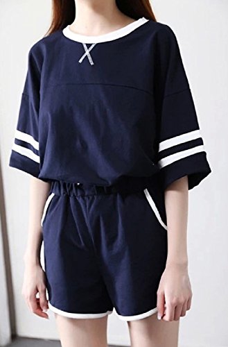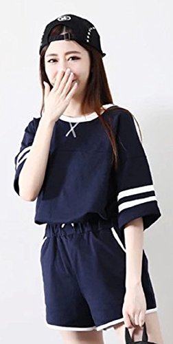 【Smile LaLa】 レディース シンプル 上下 セット アップ トップス 半袖 ボトムス ショート パンツ 丸首 部屋着 パジャマ 春 夏 (M, ネイビー)