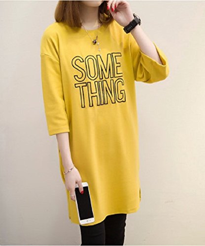 【Smile LaLa】 レディース チュニック Tシャツ プリント ロゴ Uネック 七分袖 体型 カバー ロング カジュアル ボーイッシュ (XL, イエロー)