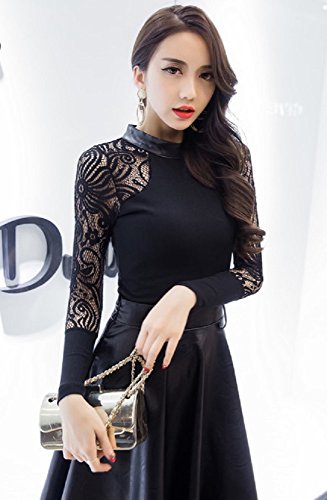 【Smile LaLa】 レディース トップス カットソー Tシャツ 長袖 レース セクシー シンプル カジュアル ブラック グレー 春 秋 (2XL, ブラック)