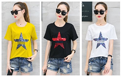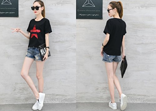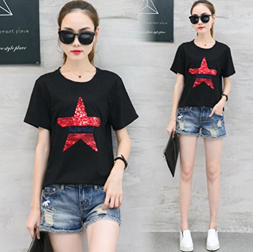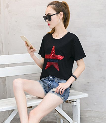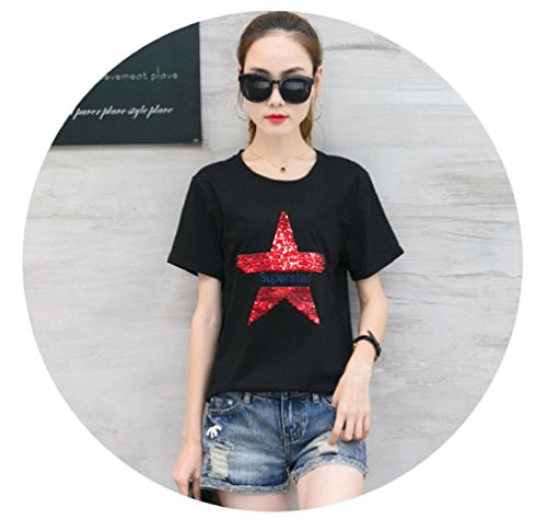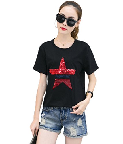 【Smile LaLa】 レディース 半袖 Tシャツ カットソー スター 星 スパンコール トップス カジュアル 英字 ロゴ 夏服 派手 女性 (ブラック, M)