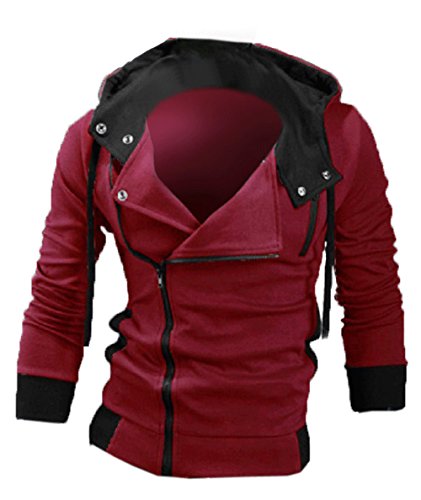 【Smile LaLa】 メンズ パーカー フード ポケット 付き アウター 長袖 重ね着 風 シンプル 無地 カジュアル ジップ アップ (ワインレッド, XL)