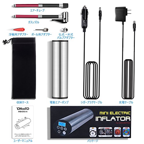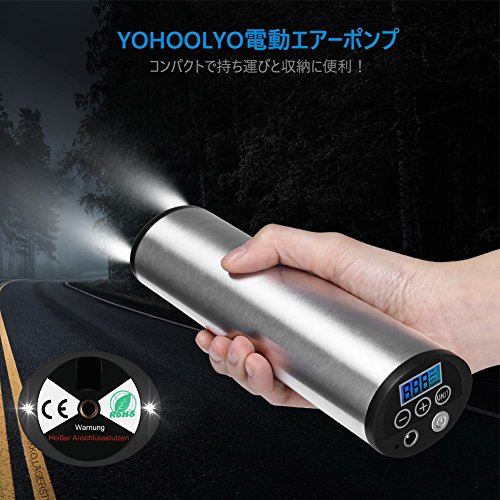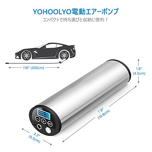 YOHOOLYO 空気入れ 電動 タイヤ空気入れ 小型電動ポンプ PSE認証 自動車 自転車 オートバイ ボール 浮輪適用 エアゲージ付き LEDライト付き LEDディスプレイ 米式 英式 仏式バルブ対応【24ヶ月保証】 (シルバー)